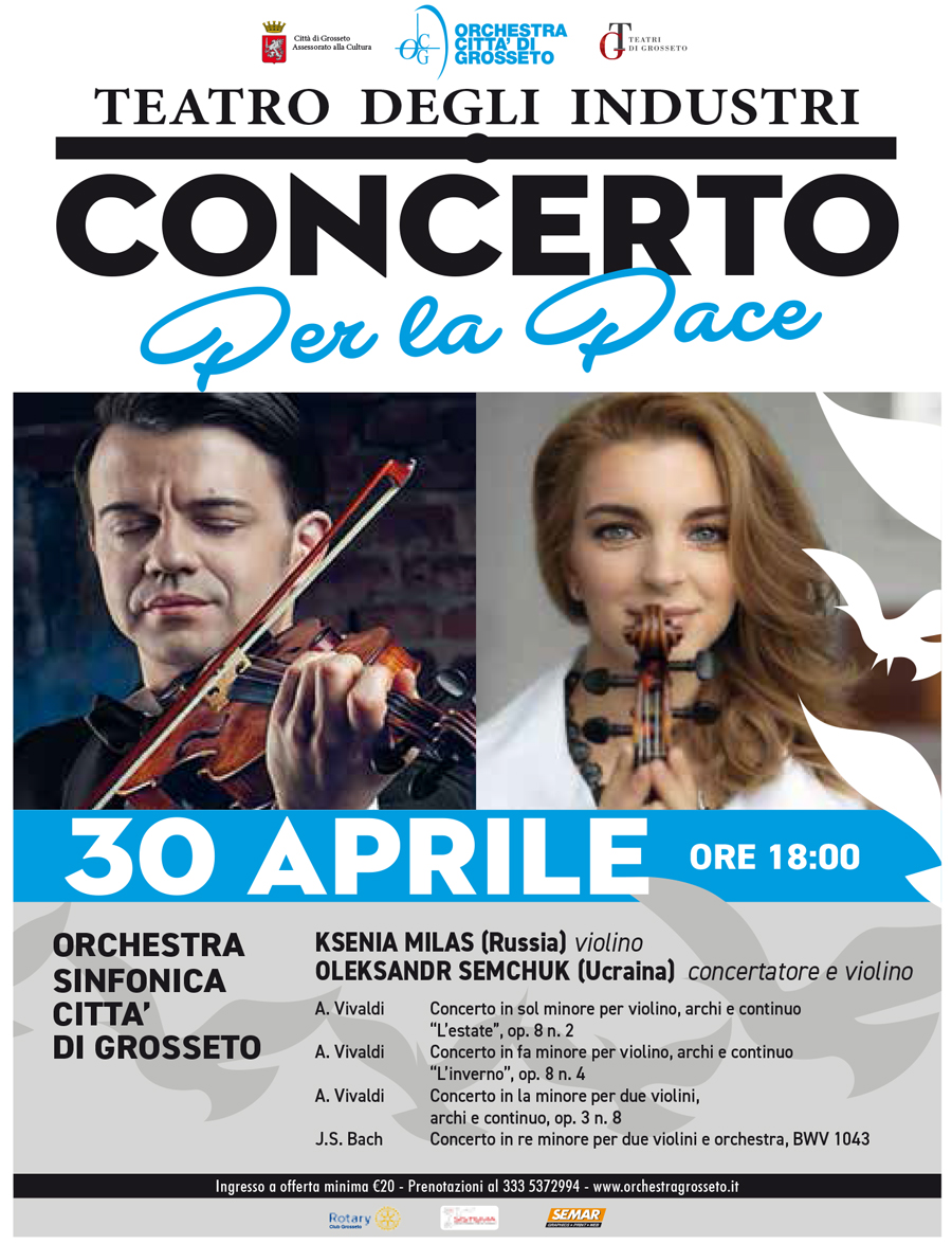 L'Orchestra sinfonica Città di Grosseto, in collaborazione con il Rotary Club di Grosseto, il Comune di Grosseto, Fondazione Grosseto Cultura, Live art.95 e Semar , organizzano il "Concerto per la Pace" con due grandi musicisti : la russa Ksenia Milas (violino) e l'ucraino Oleksandr Semchuk (concertatore e violino).