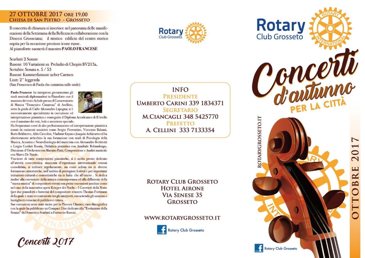 Nati da un'idea del compianto Raffaello Picchi, Presidente rotariano del nostro Club nell'anno 2011-12, ritornano per il quinto anno consecutivo i "Concerti dell'autunno rotariano", eventi musicali molto apprezzati dai grossetani che hanno sempre partecipato numerosi ad ogni concerto nelle varie Chiese e nei luoghi più conosciuti della città.