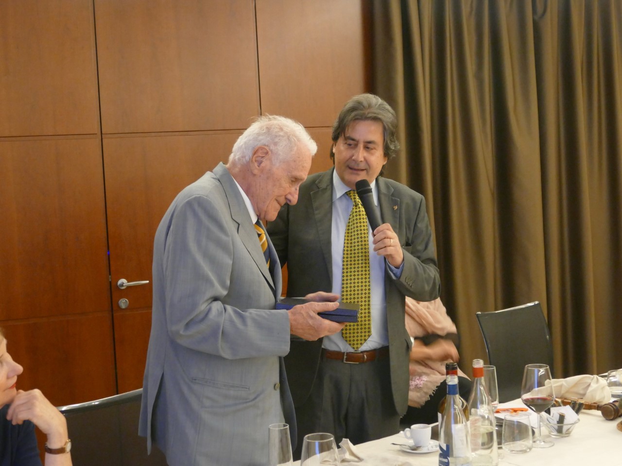 A nome di tutto il Club, il presidente Carini ha poi consegnato a Mario, visibilmente commosso e sorpreso per la serata, una targa ricordo con la seguente dedica:
