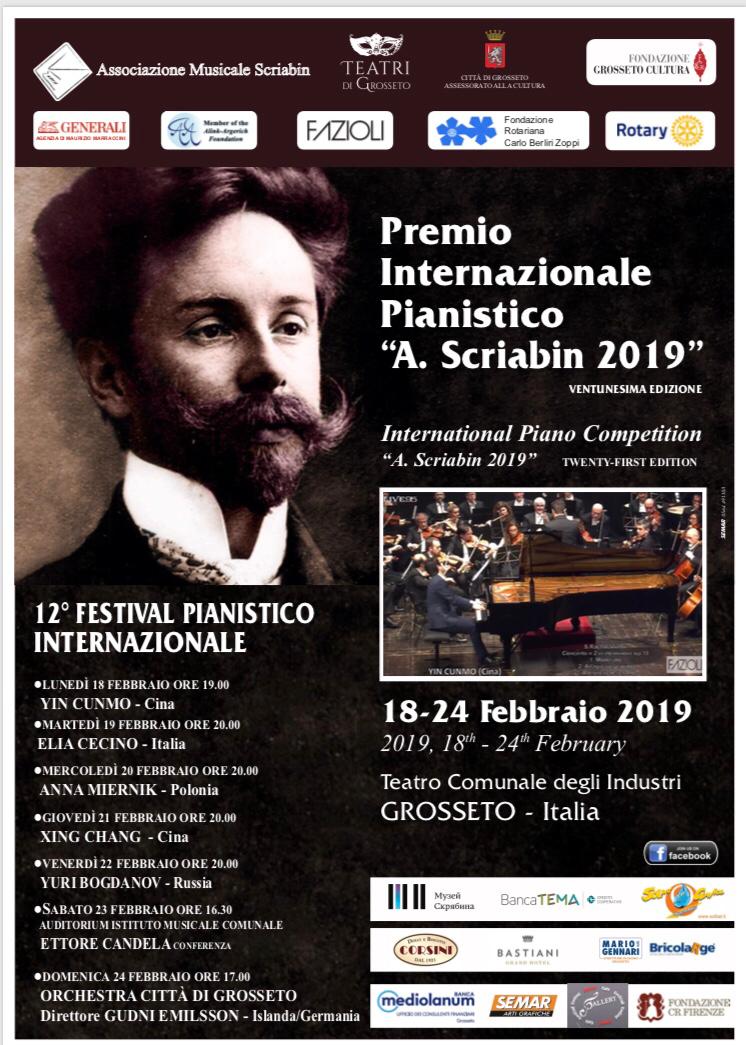 Il Premio internazionale pianistico "Scriabin", tra i più importanti concorsi in Italia dove pianisti di tutto il mondo si metterannno in gioco, organizzato dall'Associazione musicale "Scriabin" con la Fondazione Grosseto Cultura e il Comune di Grosseto, giunge quest'anno alla sua XXI edizione. Il nostro Club, insieme alla Fondazione rotariana Carlo Berliri Zoppi e ad altri sponsor ( Agenzia Generali di Maurizio Marraccini, Mediolanum di Grosseto, Fazioli, Banca Tema, Solbat, Corsini, Bastiani Grand hotel, Mario Gennari Bricolarge, Gallery Caffè, Fondazione Cassa Risparmio Firenze) ), sostiene ormai annualmente, l'importante manifestazione musicale che proietta sempre più la città di Grosseto a livelli internazionali.