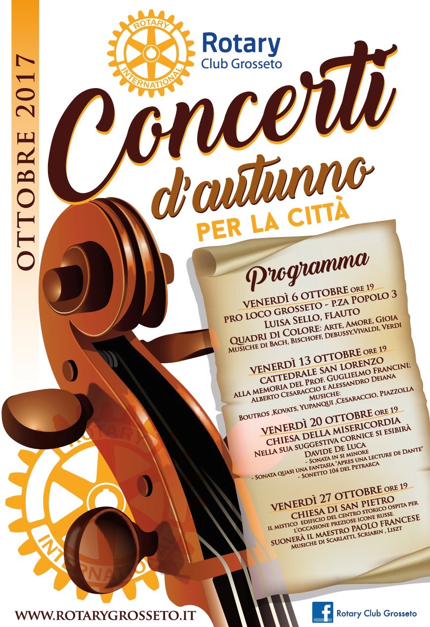 In ottobre, ormai come da tradizione, il Rotary Club di Grosseto offre alla popolazione quattro interessanti concerti di musica che si terranno a Grosseto, ogni venerdi del mese alle ore 19.
