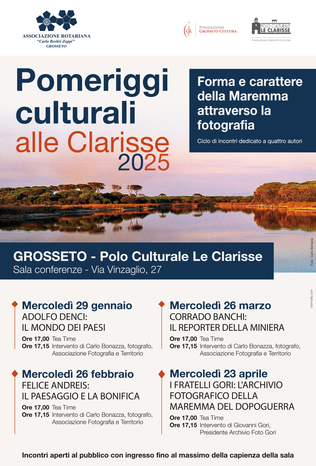 Il Presidente dell’Ass.ne Rotariana CBZ Grosseto, dottor Domenico Saraceno, ringrazia la Fondazione Grosseto Cultura che ospita questa serie di eventi presso le proprie strutture. Gli incontri si terranno infatti nella sala conferenze del Polo Culturale Le Clarisse di Via Vinzaglio, struttura che già accoglie la Biblioteca 100 Libri dedicata all’Ing. Mario Luzzetti realizzata dall’Associazione Rotariana Carlo Berliri Zoppi.